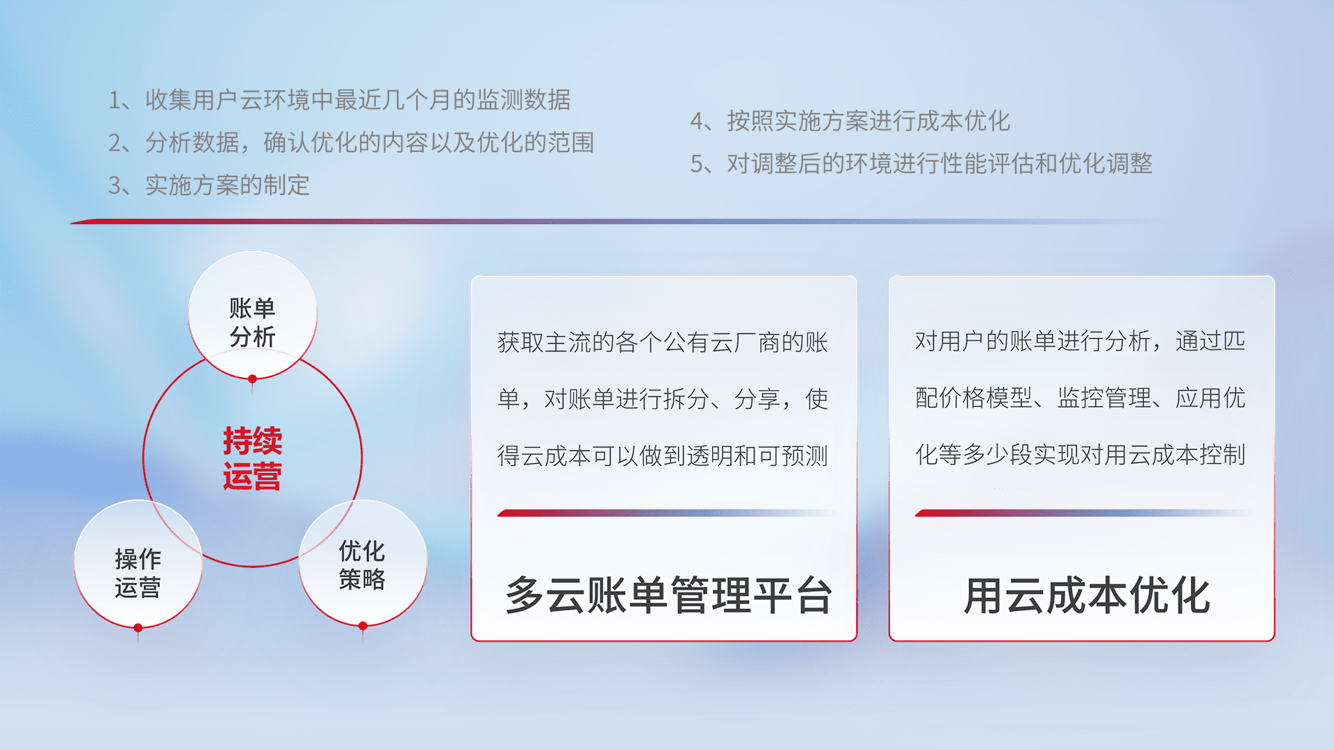 通过多云纳管,,,以统一的资源数据模型把客户的云资源进行抽象和封装,,进而实现对多云资源的统一操作,,,保障云资源管理的可靠性、、稳定性与可用性。。。量身定制化运维内容,,,配置、、开发运维、、、、补丁管理、、备份、、、监控、、、认证和访问管理、、、、审计和日常巡检等,,,,保障在用云过程中的可靠度,,,,稳定度以及高可用率。。
